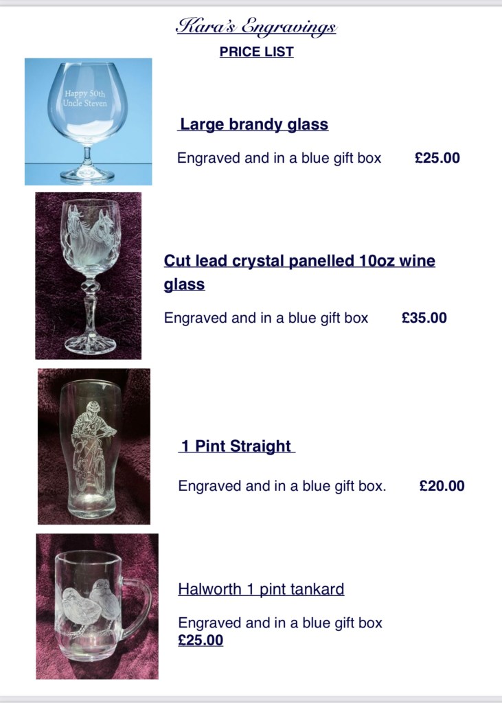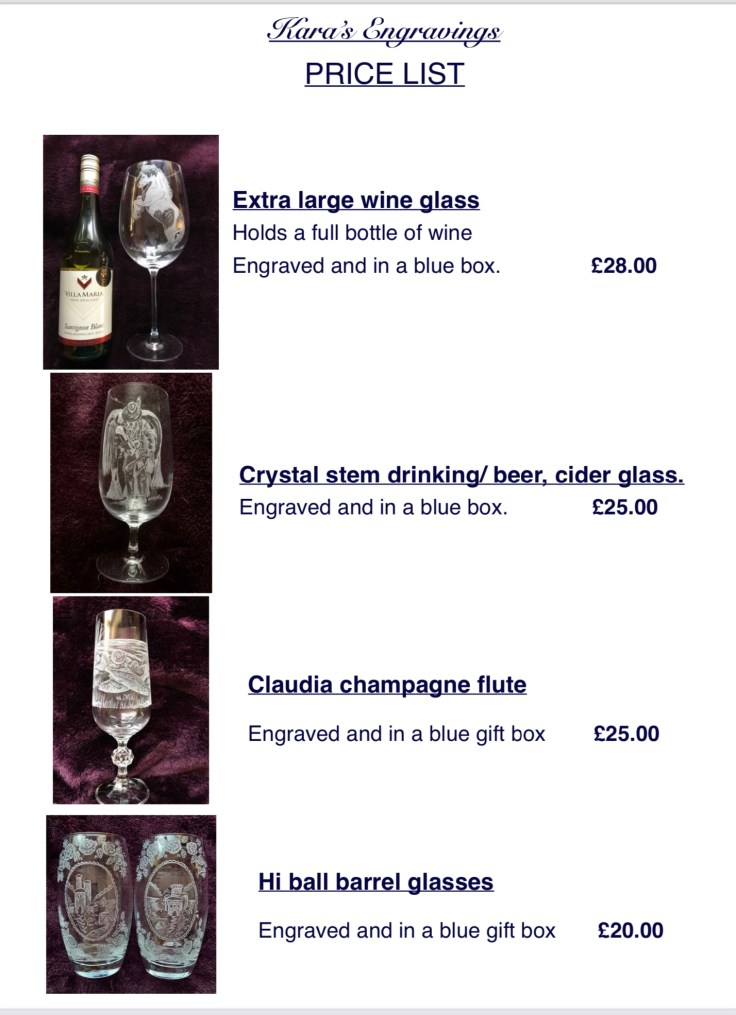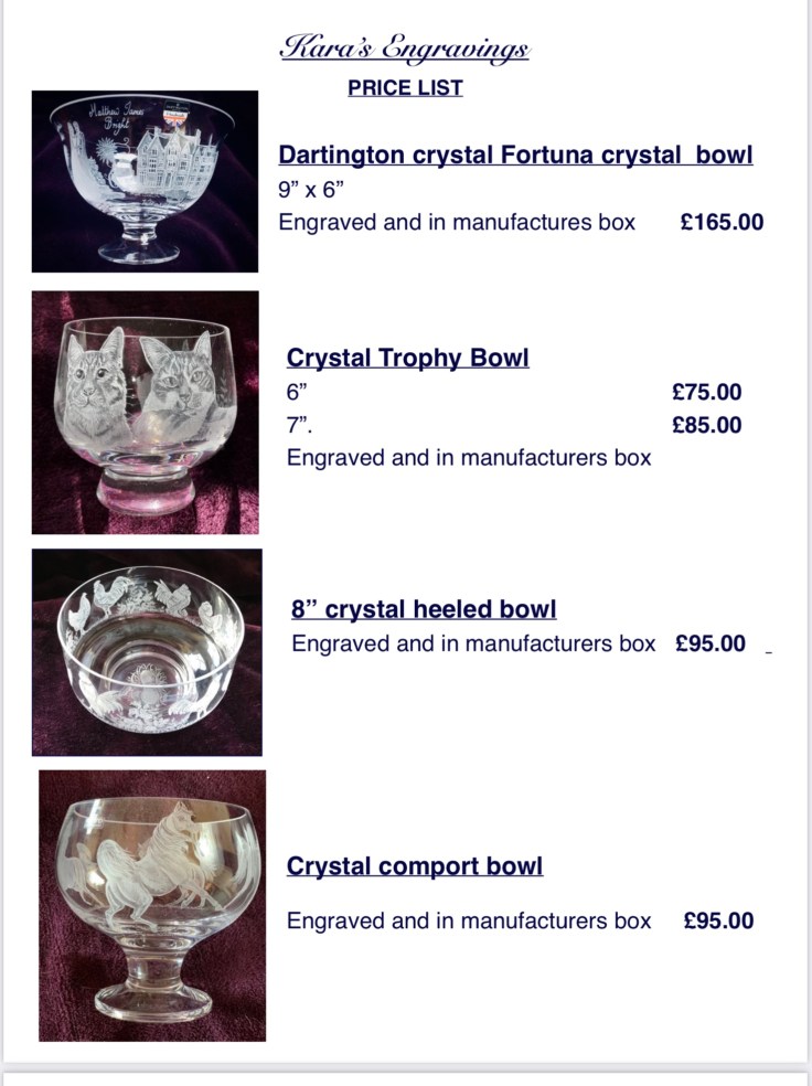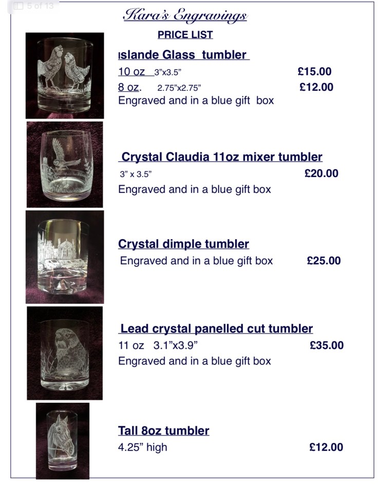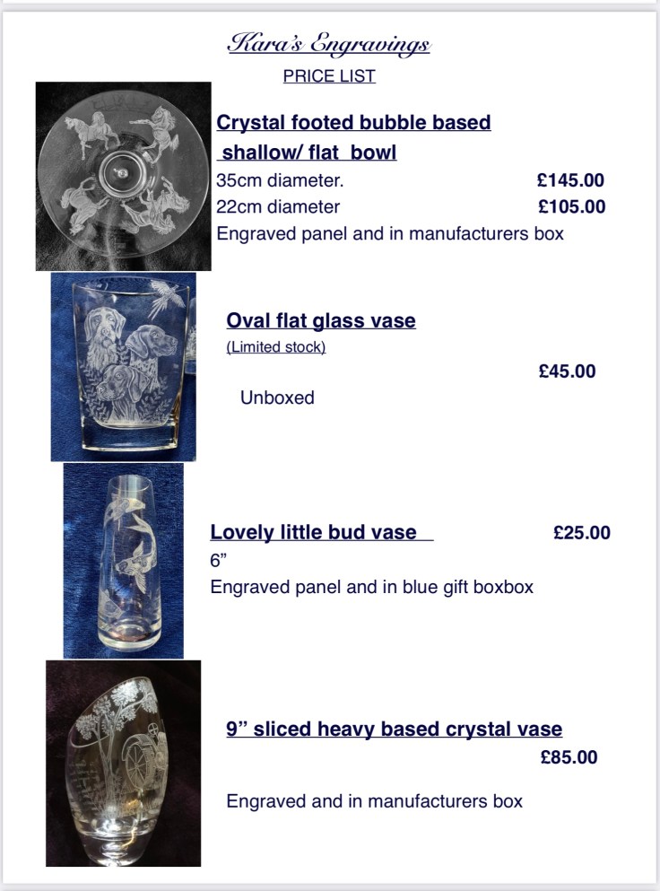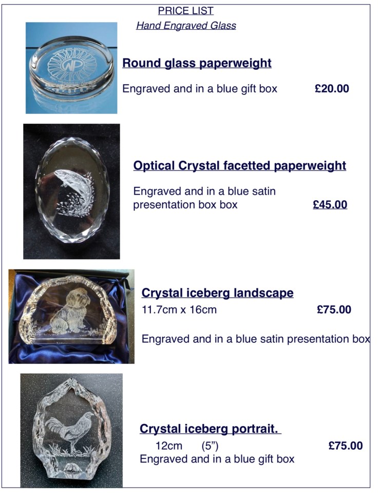 First choose the glass you would like, send me the photos you would like me to work from , I will sketch the image onto the glass for your approval before I start engraving. All my work is completely done freehand without the use of stencils or sandblasting so each piece is totally unique and individual,